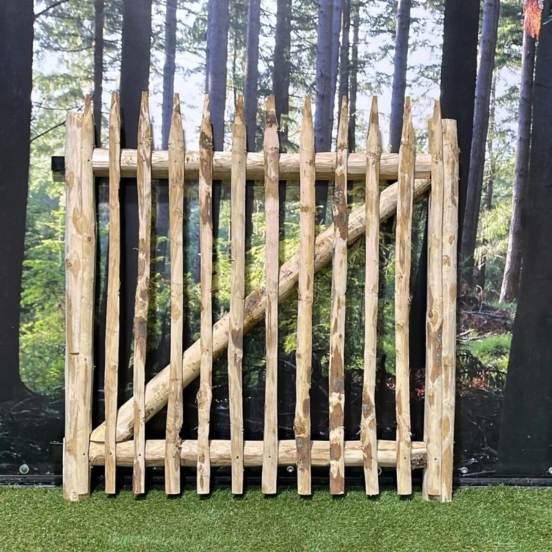 De poorten van Frans kastanjehout zijn van hoge kwaliteit en verkrijgbaar in 3 standaard hoogtematen en 3 standaard breedtematen of verkrijgbaar in elke door u gewenste maat. Te gebruiken als enkele of dubbele poort. De poorten zijn voorzien van zwart hang- en sluitwerk, waarvan de duim verstelbaar is. De half houts verbindingen geven de poorten een nostalgisch uiterlijk en combineren natuurlijk perfect met de kastanje schapenhekken en de palen. Kom bij ons langs en bekijk de verschillende opstellingen.