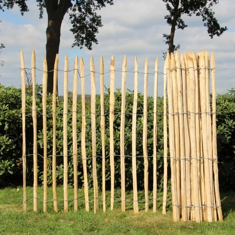 Onze kastanje schapenhekken zijn gemaakt van duurzaam en onbehandeld Frans kastanjehout. De latten met een lengte van 175 cm. en een latafstand van 4 cm. kunnen makkelijk tot wel 15 jaar mee. De latten worden bij elkaar gehouden door vier gevlochten en gegalvaniseerde ijzerdraden. Het hek is verkrijgbaar per rol van 5 mtr. en is eenvoudig te koppelen aan een volgend hek. Wij raden aan om elke 2 mtr. een kastanjepaal te gebruiken met een lengte van 2,50 mtr.